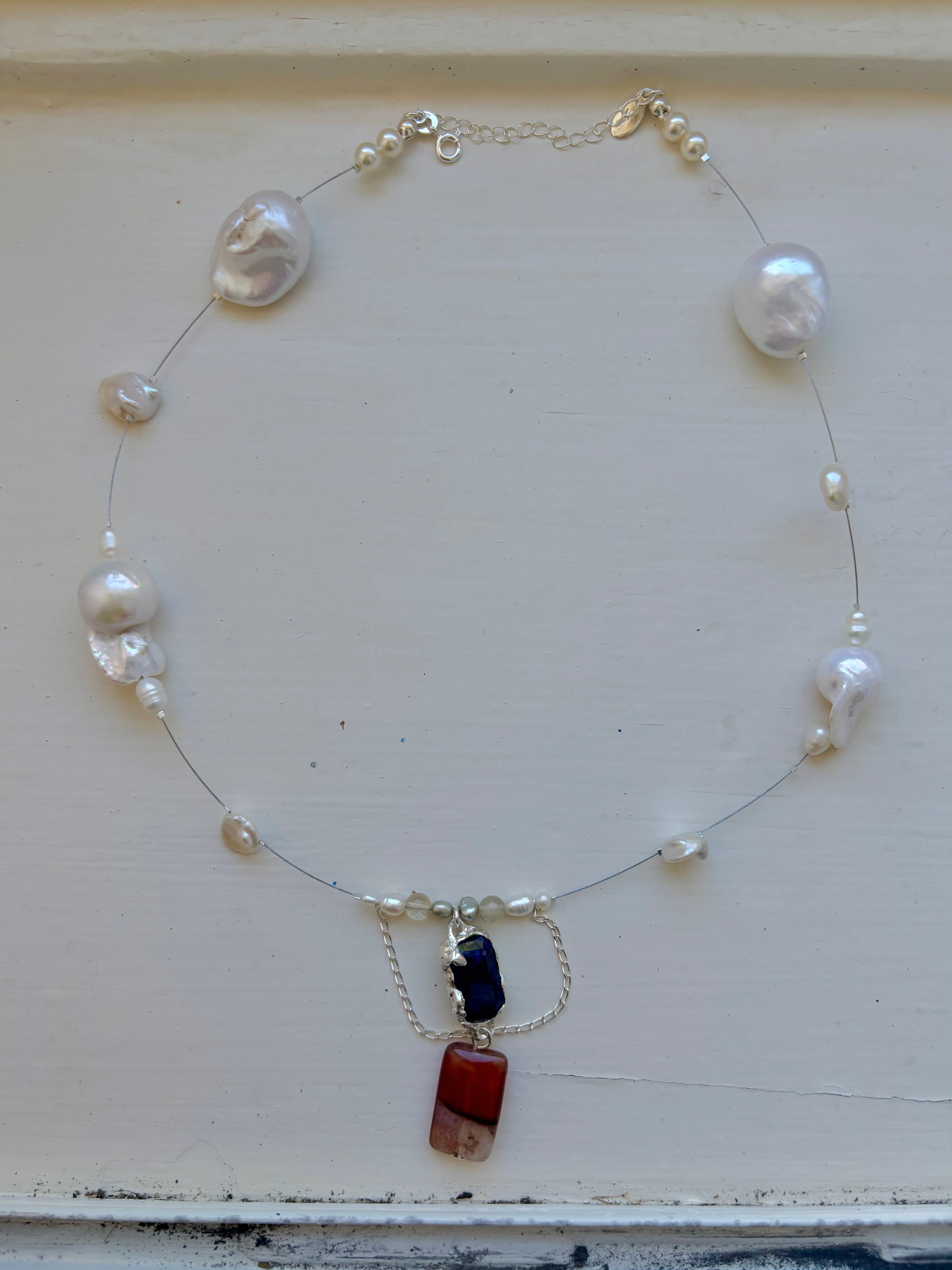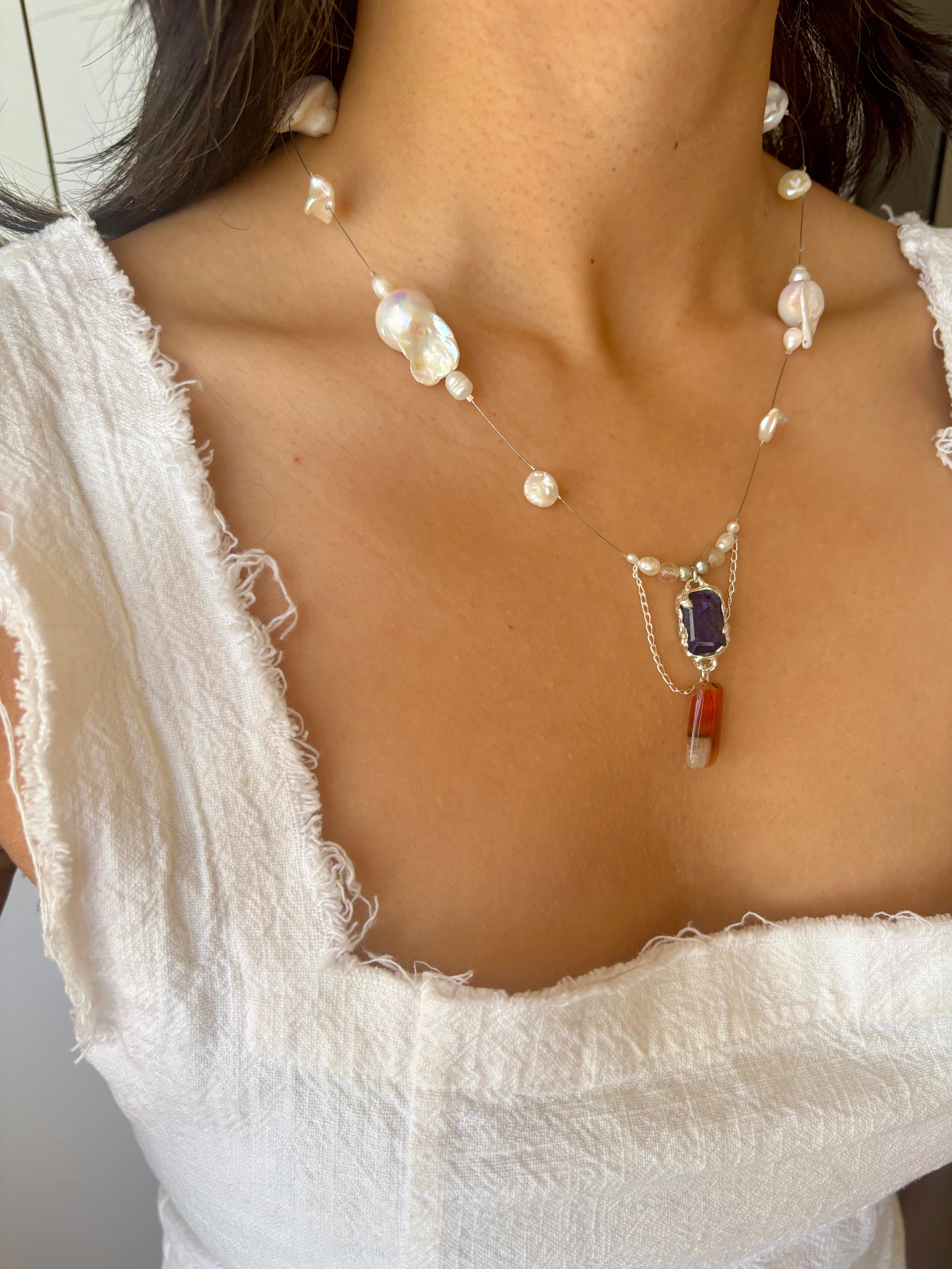 Strung with keshi pearls, baroque pearls, freshwater pearls, and Swarovski pearls, each piece is composed intuitively, allowing the natural forms of the materials to guide the final arrangement.
