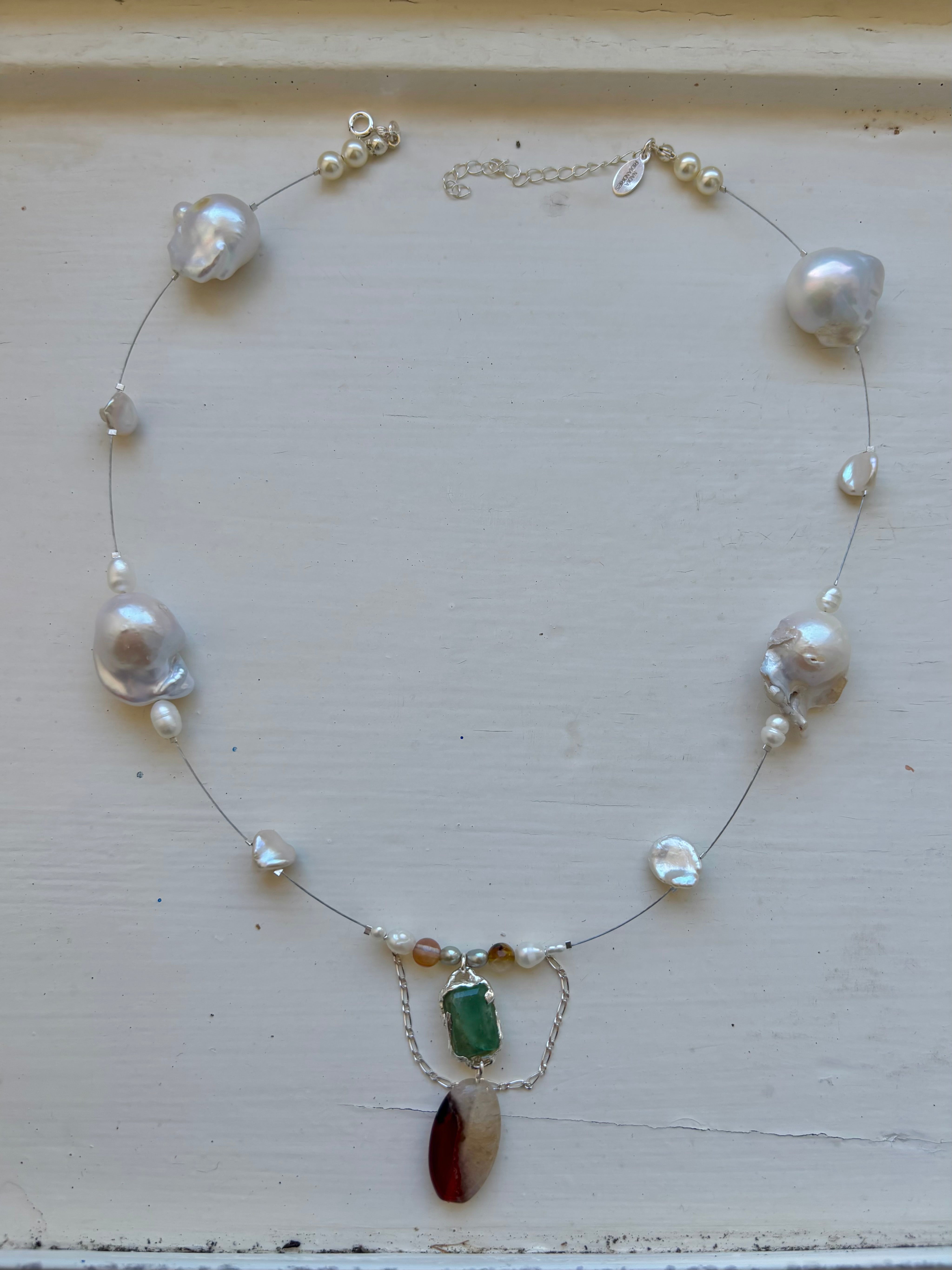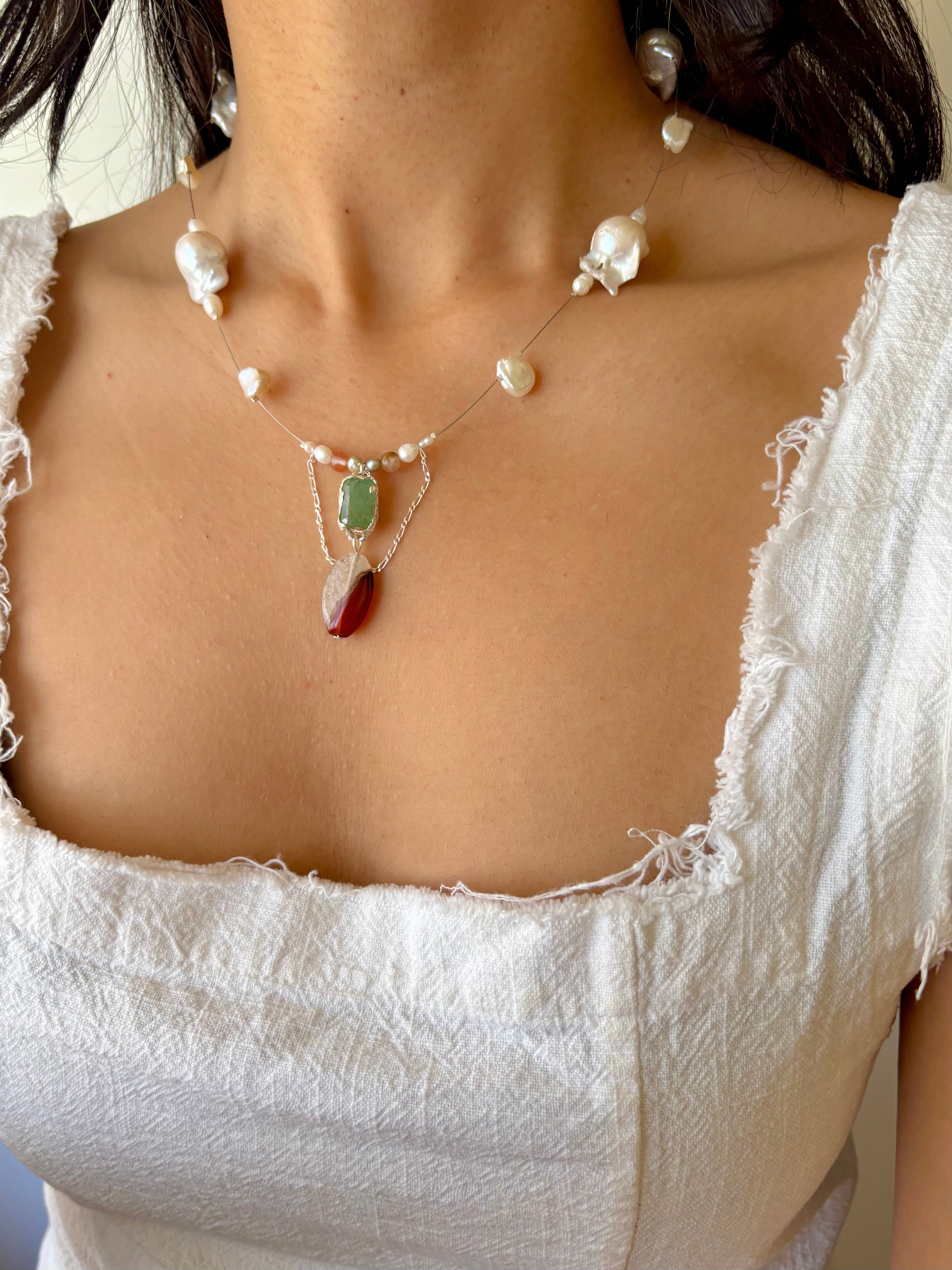 Strung with keshi pearls, baroque pearls, freshwater pearls, and Swarovski pearls, each piece is composed intuitively, allowing the natural forms of the materials to guide the final arrangement.