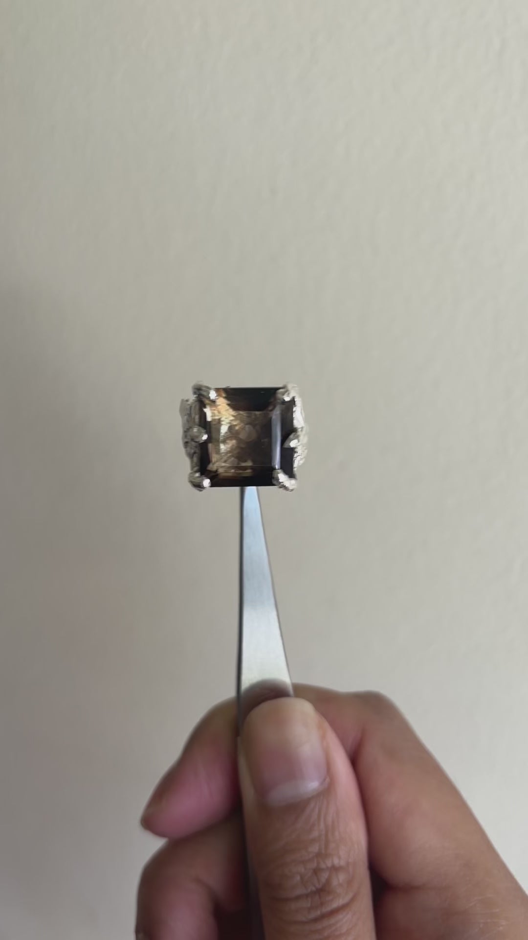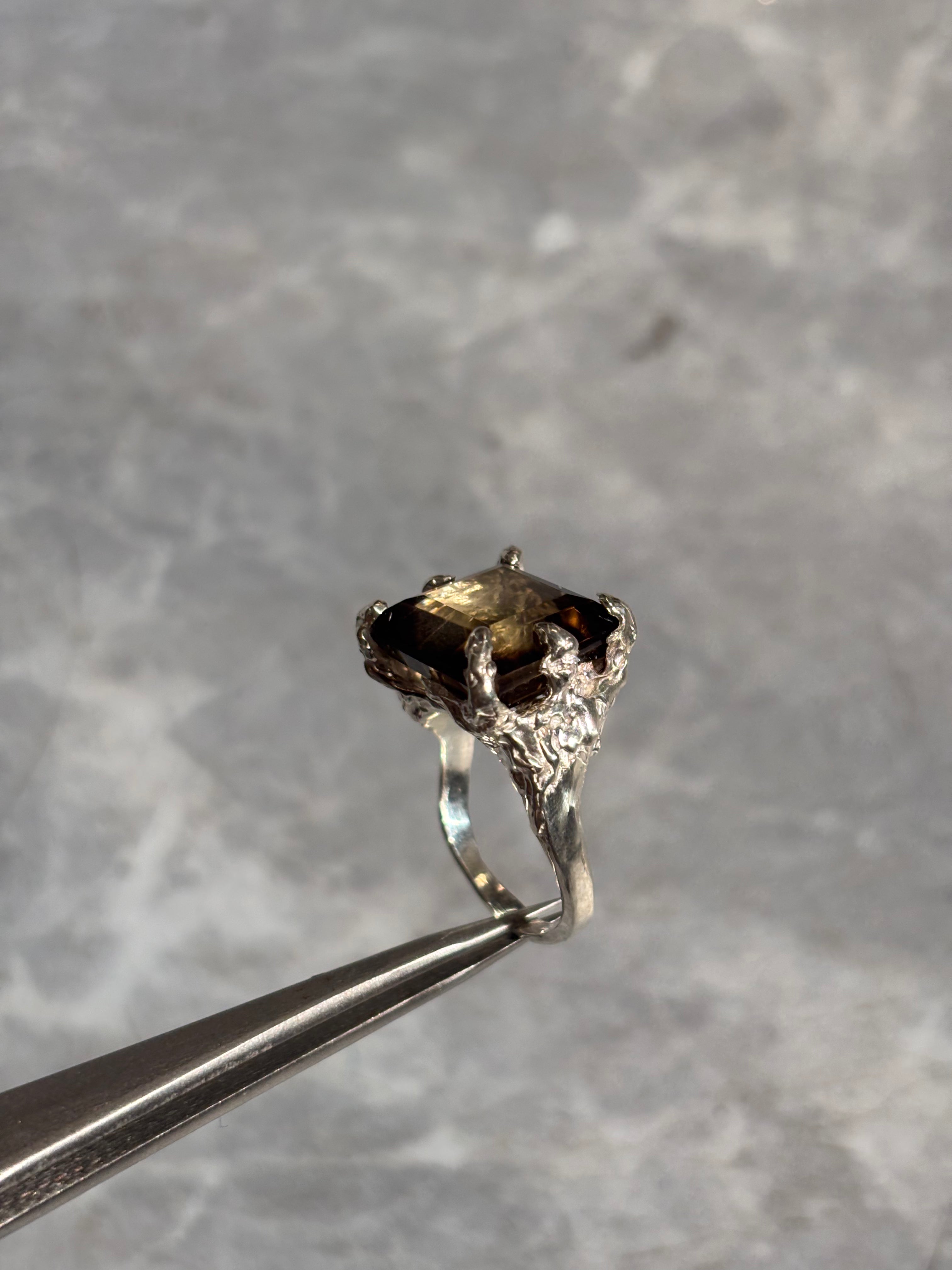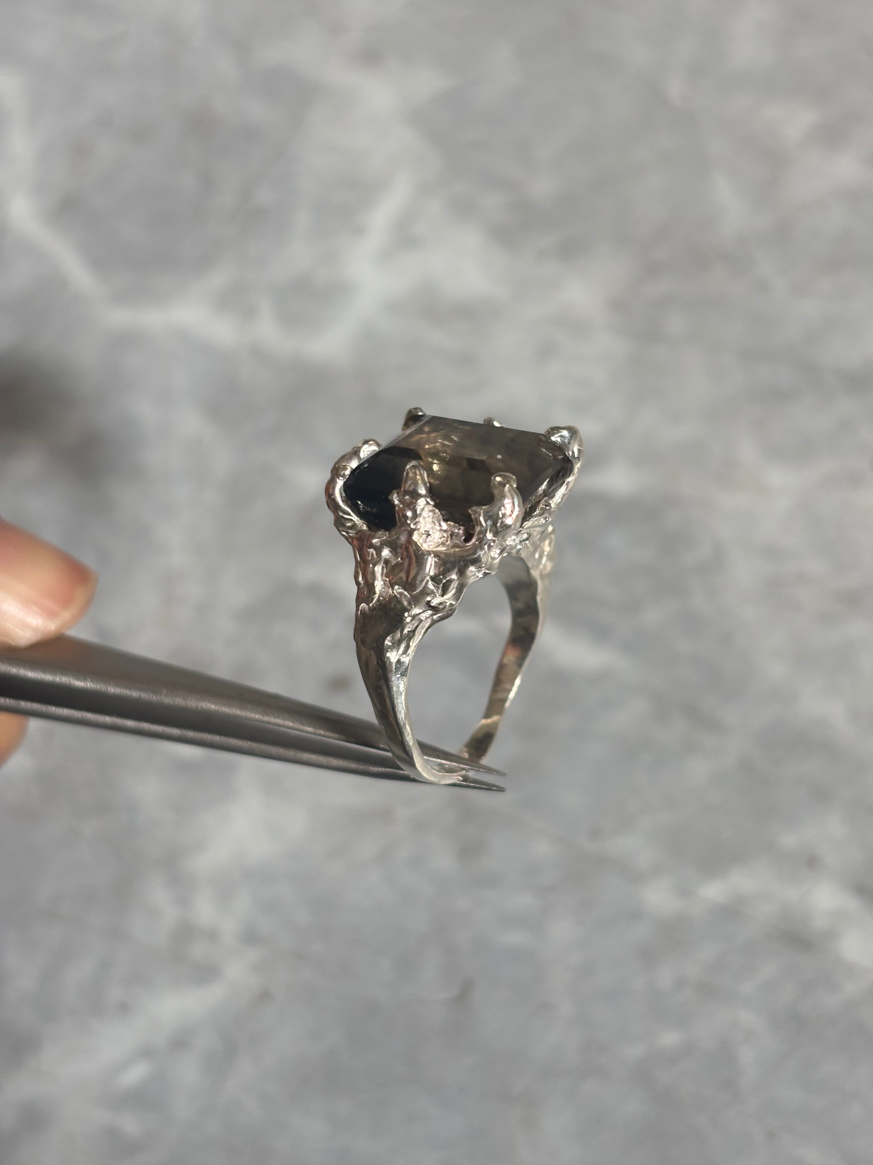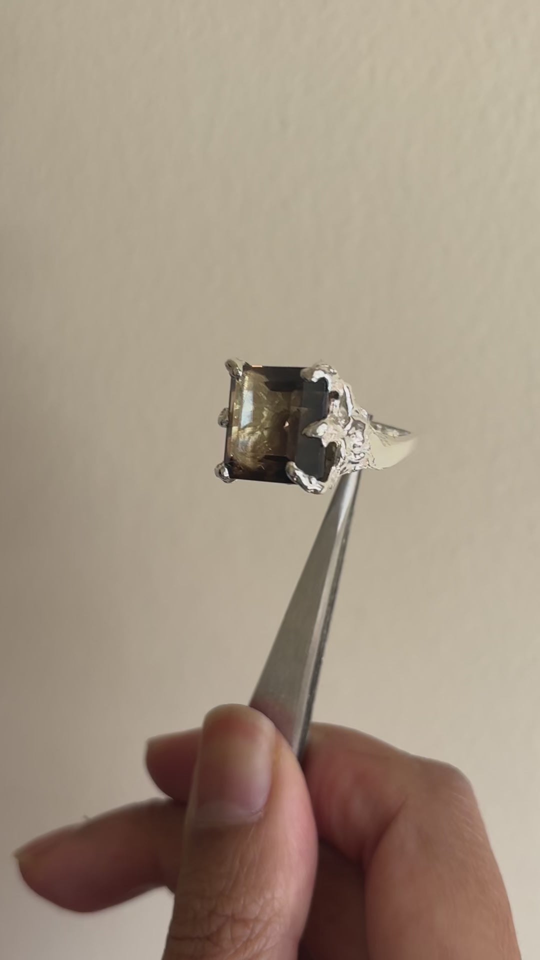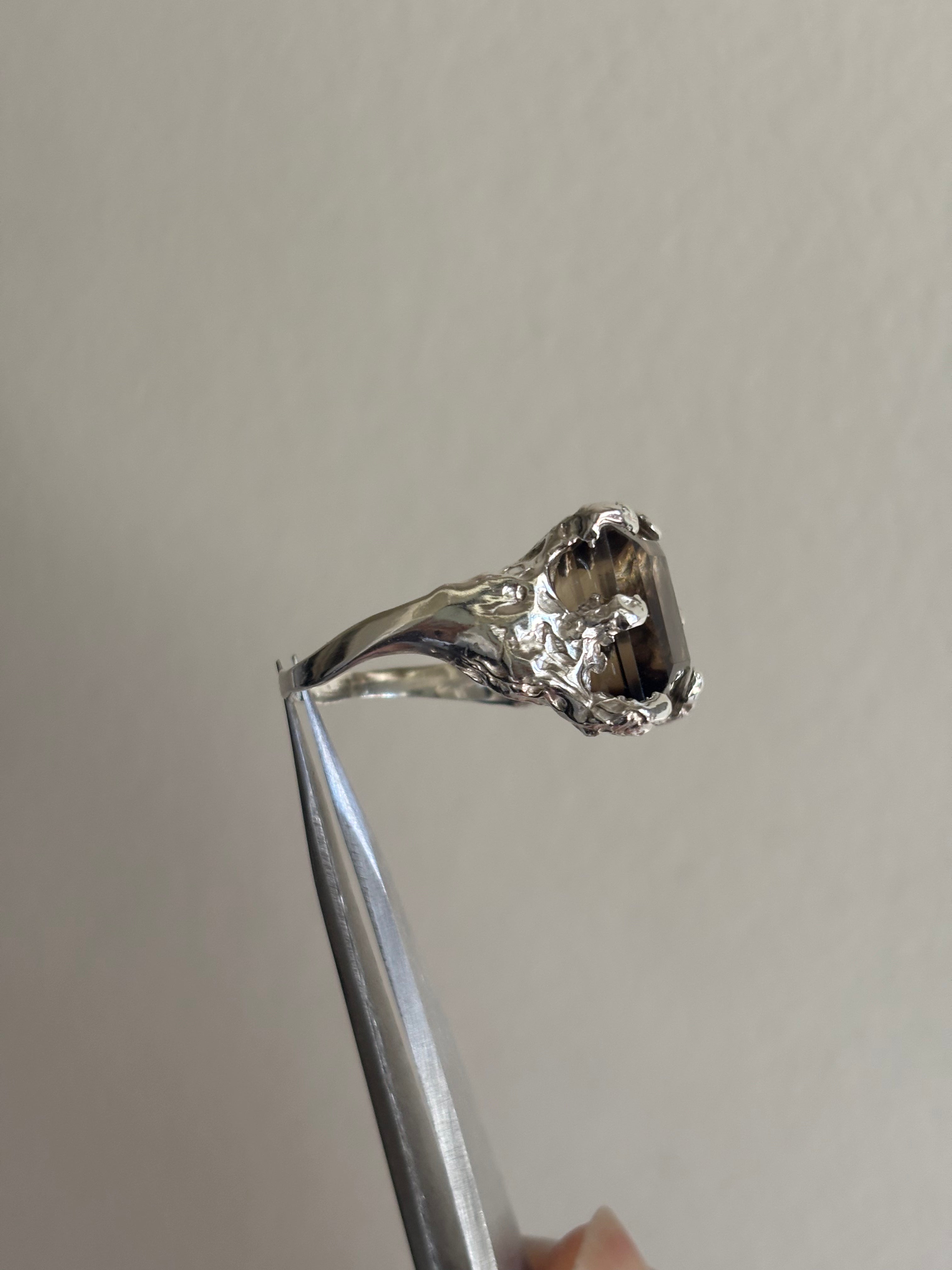 The Arcadia ring is handcrafted in sterling silver and set with a princess-cut tourmaline gemstone. Surrounding claws securely hold the stone in place, while our signature blob-textured design flows gracefully down the band, fading into a smooth, polished finish at the back.