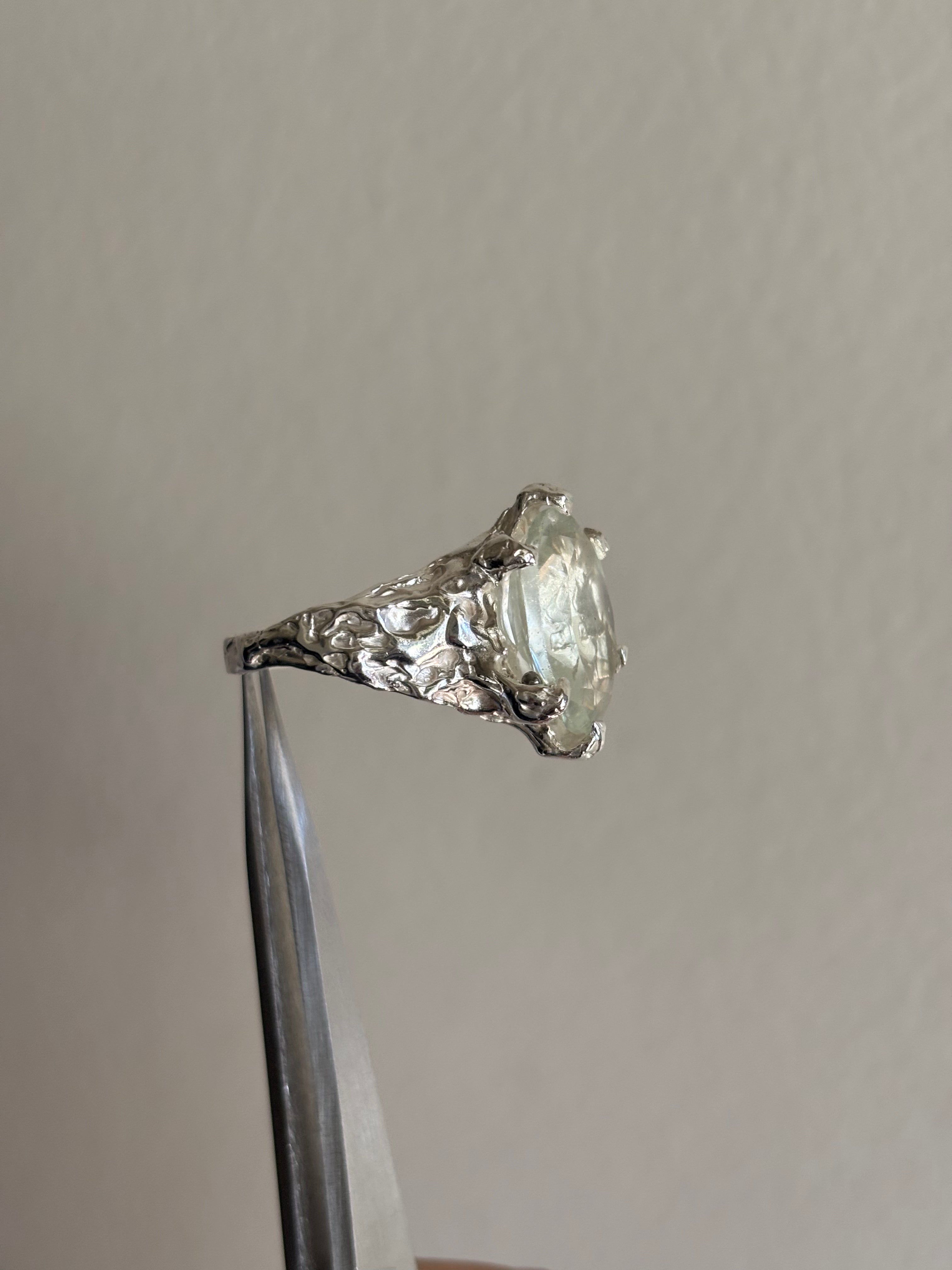 The Arcadia ring is handcrafted in sterling silver and set with a oval cut green amethyst gemstone. Surrounding claws securely hold the stone in place, while our signature blob-textured design flows gracefully down the band, fading into a smooth, polished finish at the back.