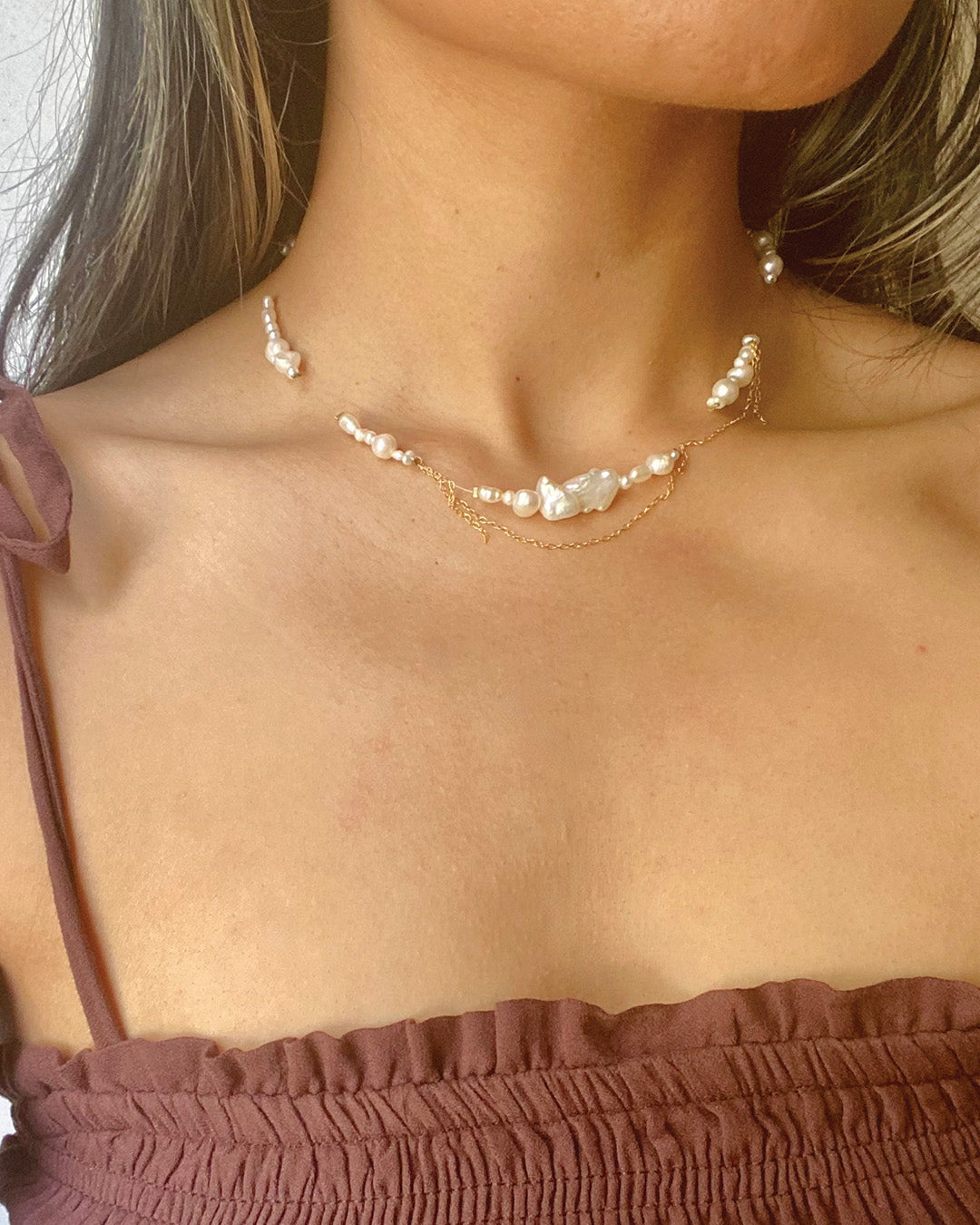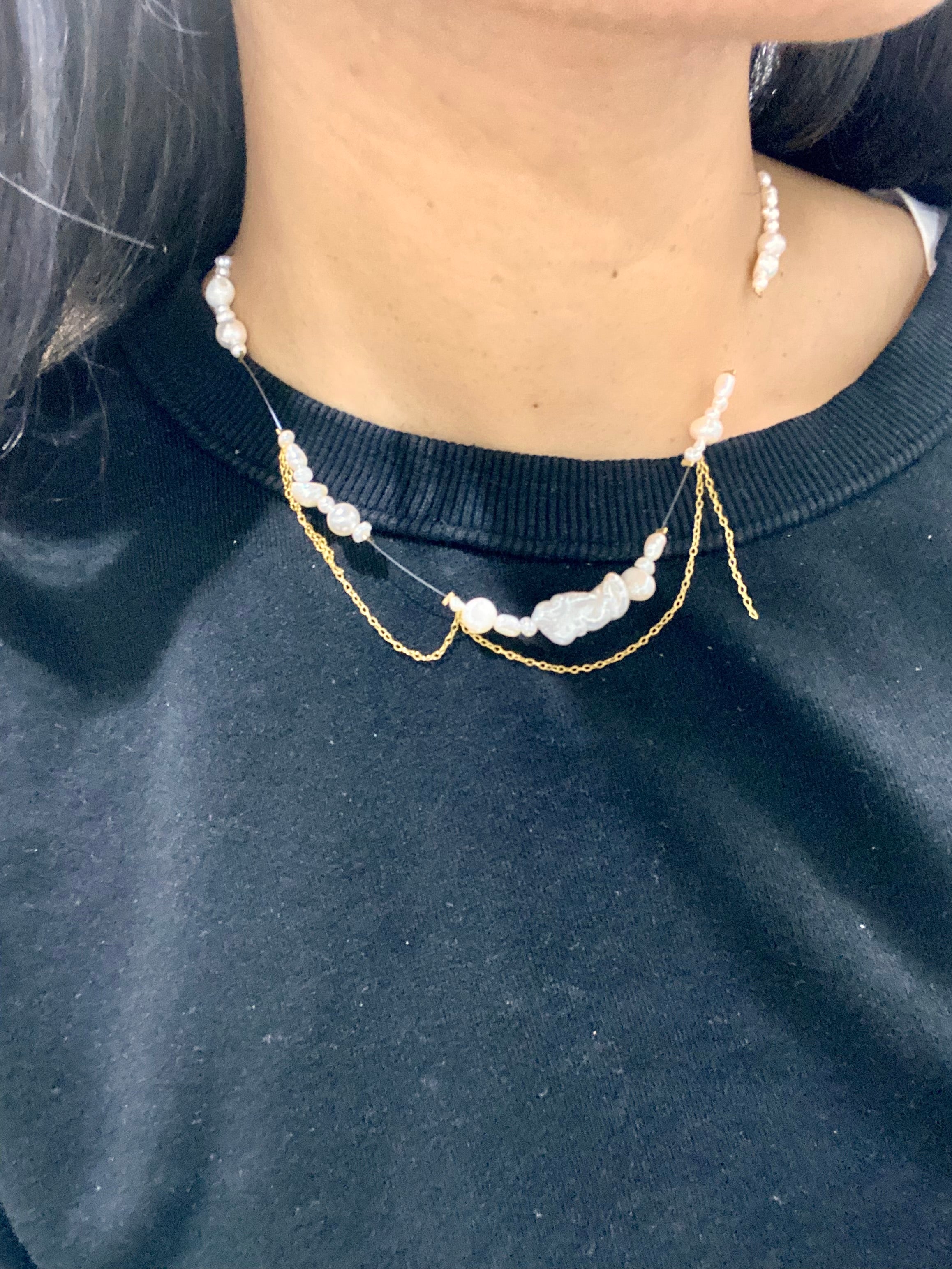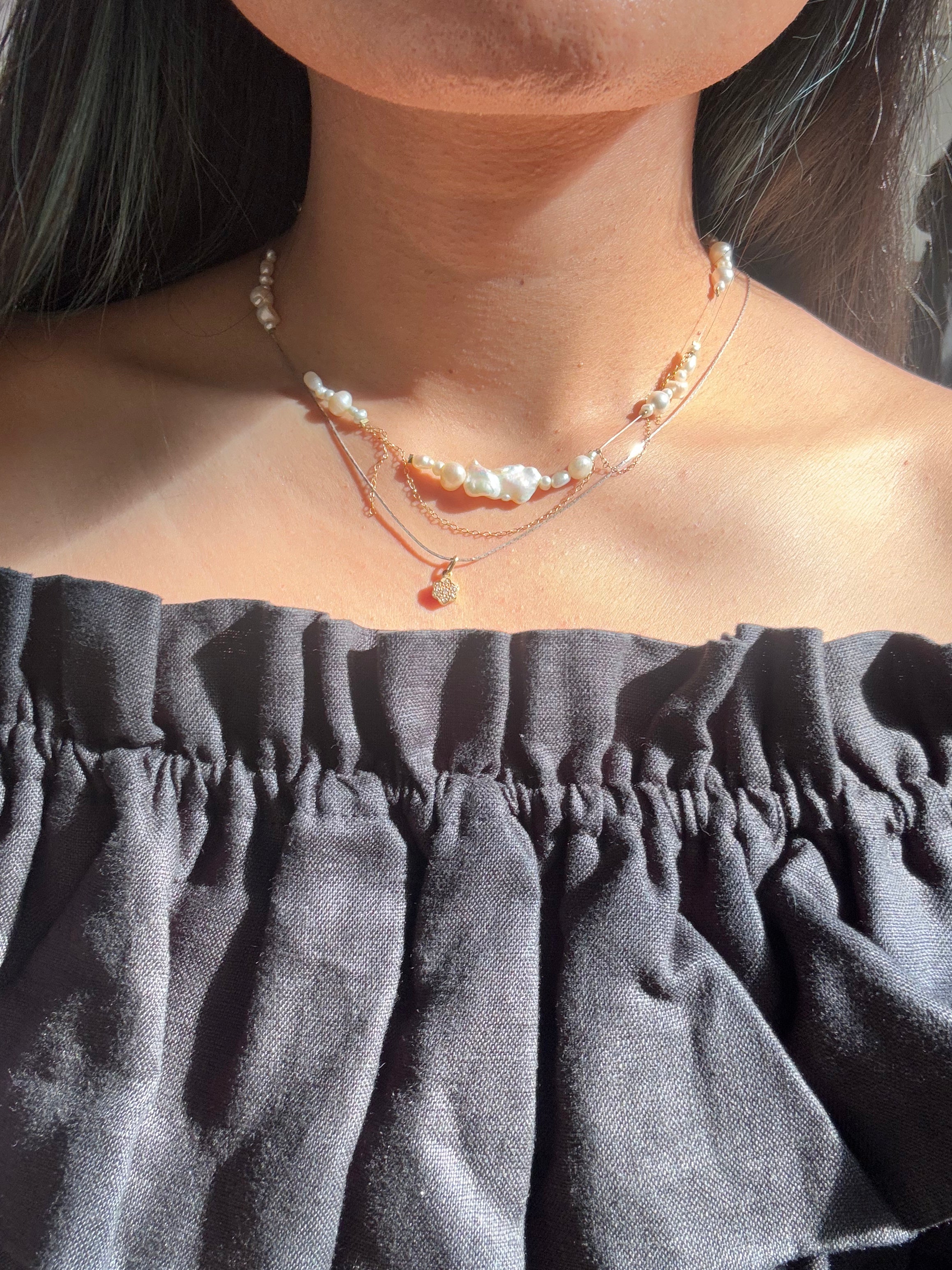 This necklace includes a fine gold filled and a statement Freshwater Biwa pearl.