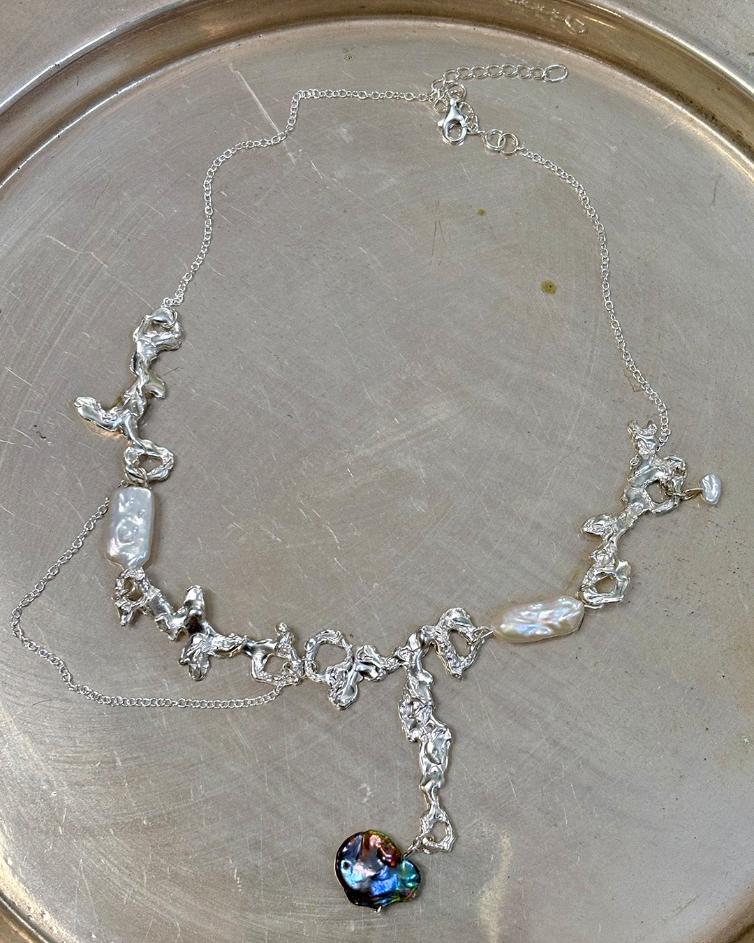 A Tree? A Coral? This sterling silver necklace has drippy pendant links with biwa pearls connected in between the pendants, a black baroque pearl and a tiny freshwater pearl. The chain is a fine sterling silver chain, including a sterling silver clasp and extension chain for closure and for adjustment.